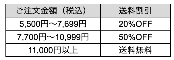 ※1回のご注文金額が7,700円(税込)の場合は送料50%OFF、11,000円(税込)以上の場合は、送料無料です。